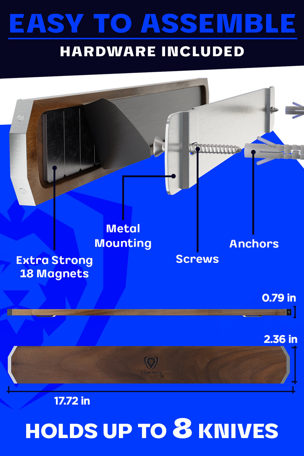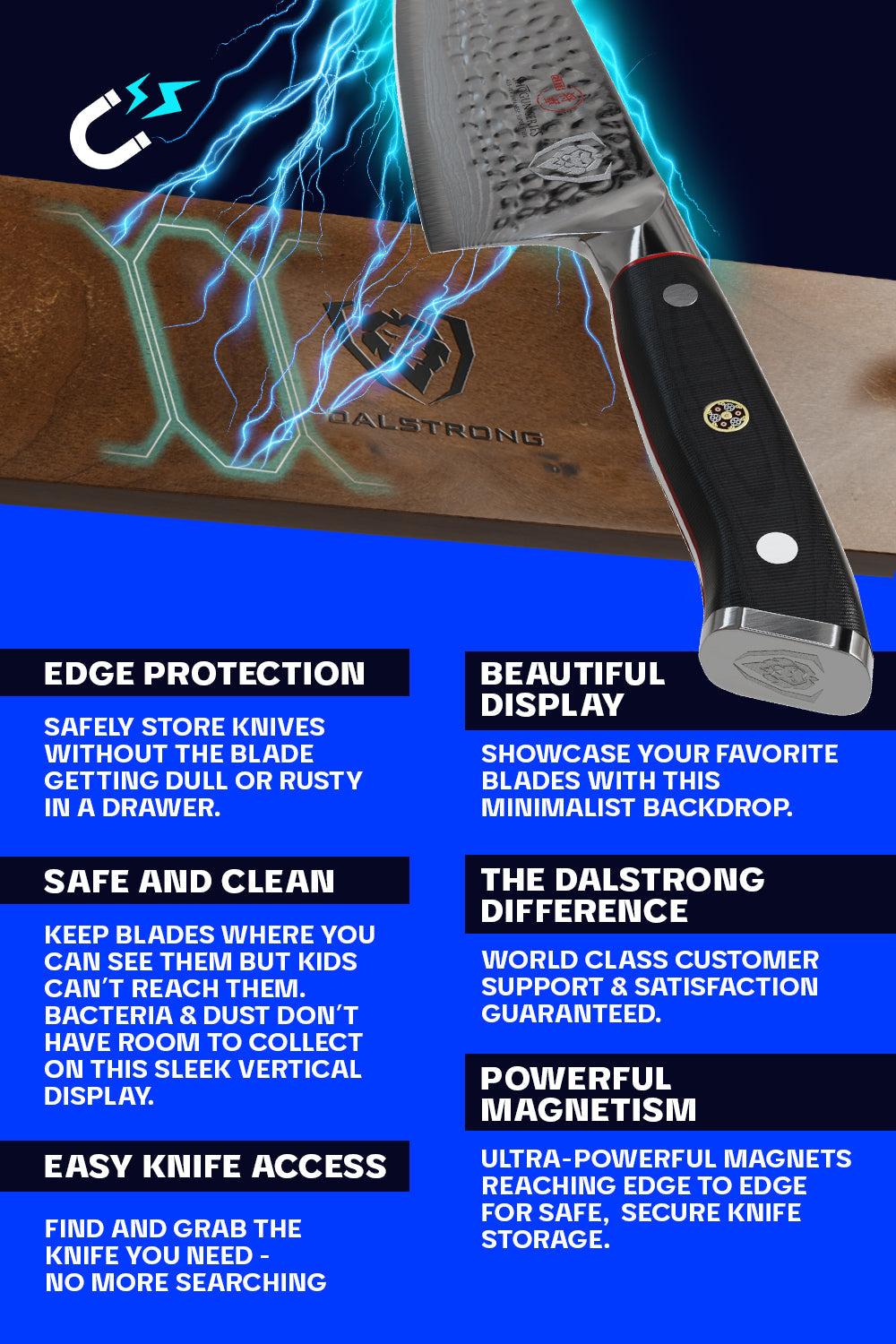 Made from North American Walnut wood hot-stamped with the Dalstrong lionhead, this magnetic bar is not just a stunning and elegant visual addition to your kitchen design: It also serves to protect the blade every time it lands against the grain.