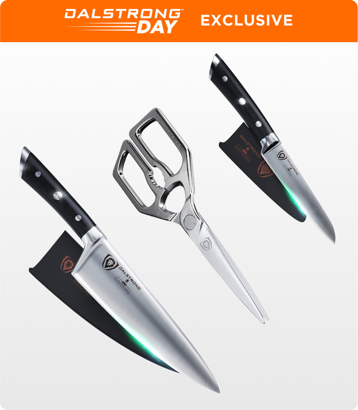 Everything a home chef needs to step up their game. This dependable trio brings together the two most essential knives from our Gladiator Series—plus Dalstrong’s heavy-duty kitchen scissors—to give you pro-level confidence from prep to plating.Popular add ons