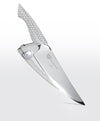 Whether slicing into a cool watermelon or carving a roast hot out of the oven, the Frost Fire bread knife can apply just the right pressure. Slice through cakes, pastries, melons, squashes, and anything big and delicate. The serrated teeth on this long blade stay scalpel-sharp for ages and can gently slice their way through foods without crushing the crust or mashing delicate fillings. The Frost Fire Series – a collection of light-weight, razor-sharp, knives with an icy cold look, and fiery effective performance. Built for the modern chef who appreciates meticulously crafted, professional knives, that look and feel good, without any sacrifices to functionality.