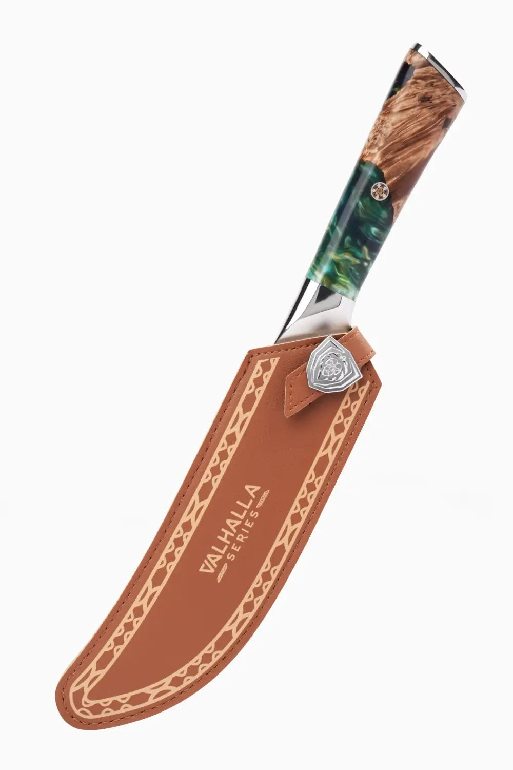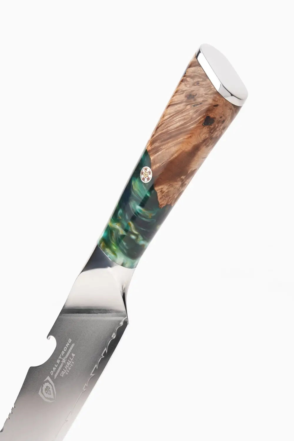 Feast on the spoils of your latest conquest with this Valhalla series 8" Pitmaster. Portion and slice meats and large vegetables with the 8” blade, and use the forked tip to transfer slices from board to plate, pan, or grill. Crack open a bottle of mead with the bottle opener along the spine. Enter the great hall, and rejoice.