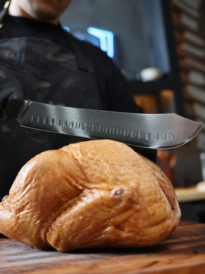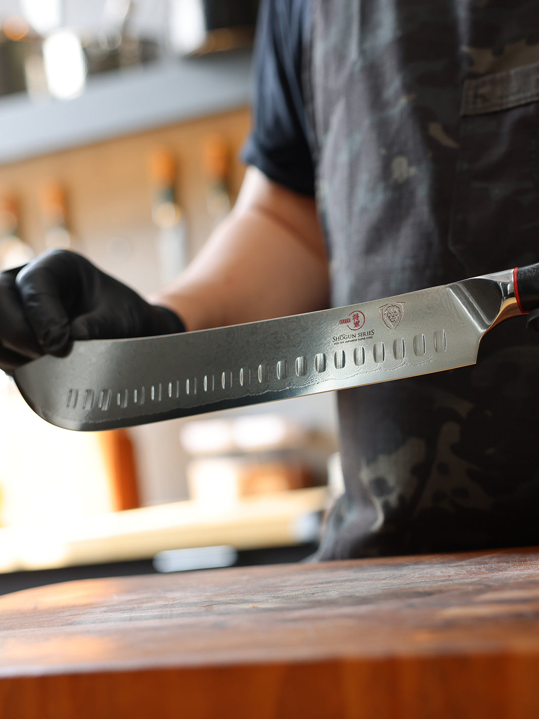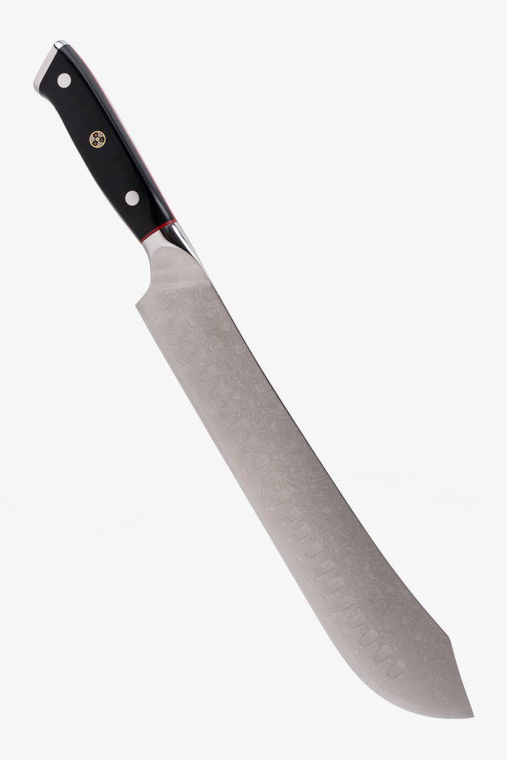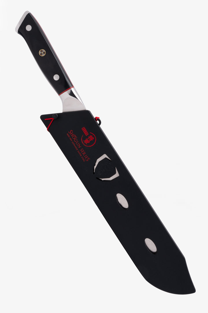 Expertly crafted to masterfully slice through flesh, break through cartilage and trim fat from beef, pork, poultry, fish and other meats, the Shogun Series 10” Bull Nose Butcher’s Breaking Knife is an essential addition to any butcher’s arsenal. The rounded-tip of this breaking knife is engineered to perfection and serves to increase the strength of the blade tip, while the additional length and curved nose afford longer, cleaner cuts and effortless skinning abilities.