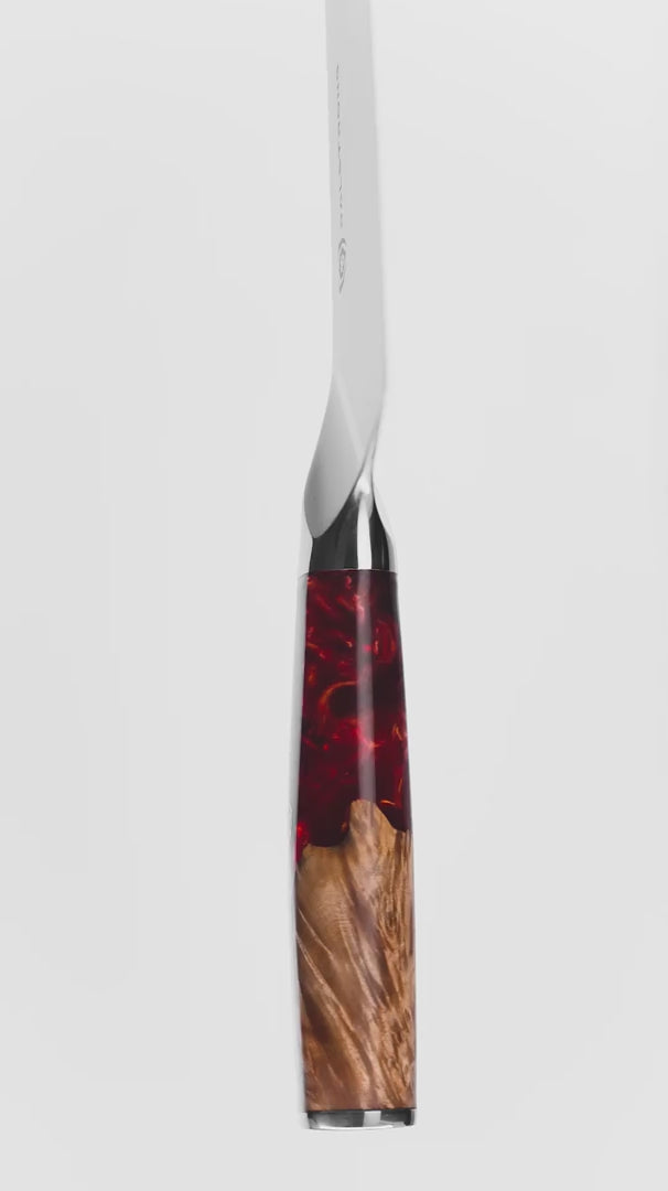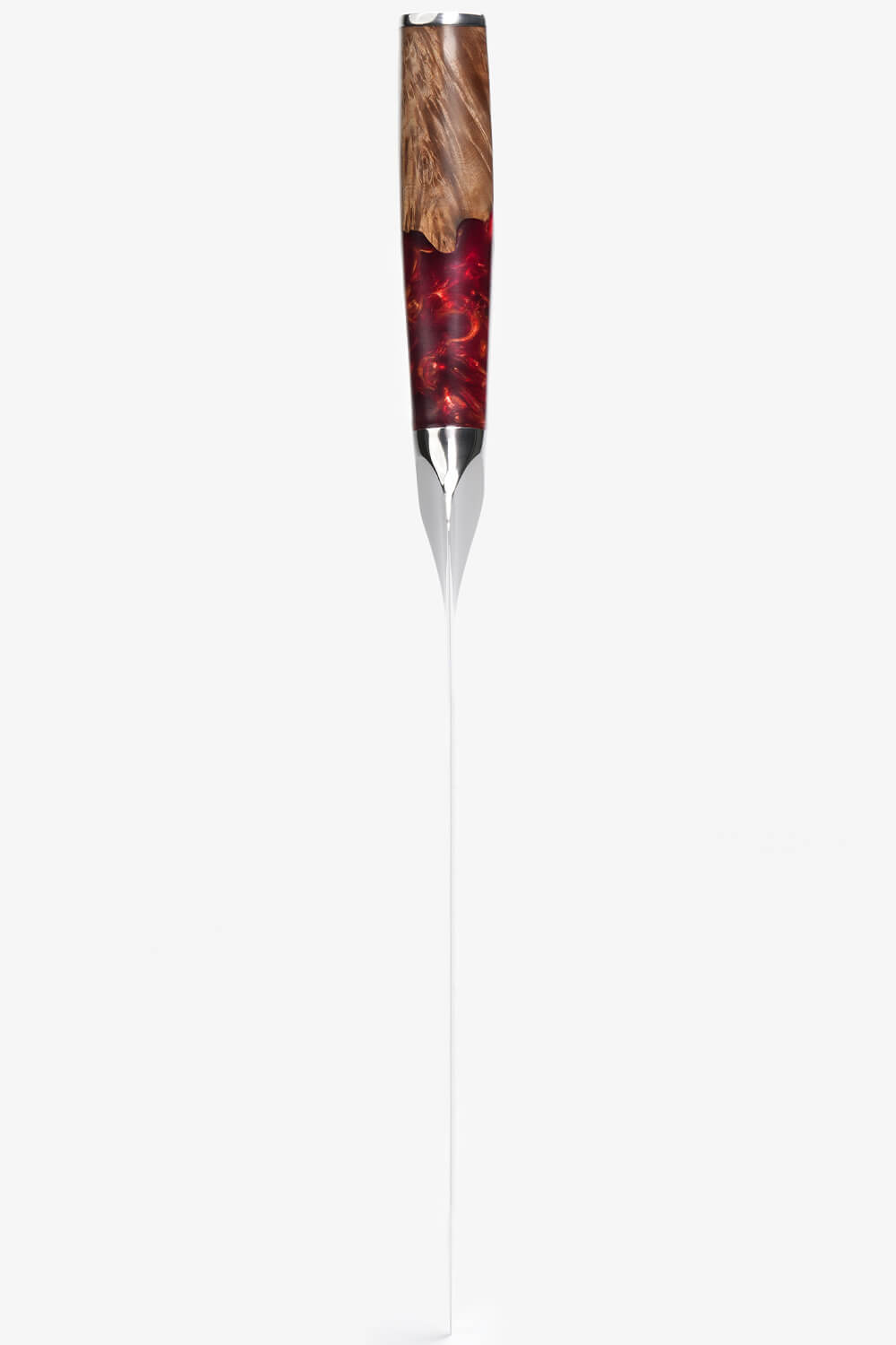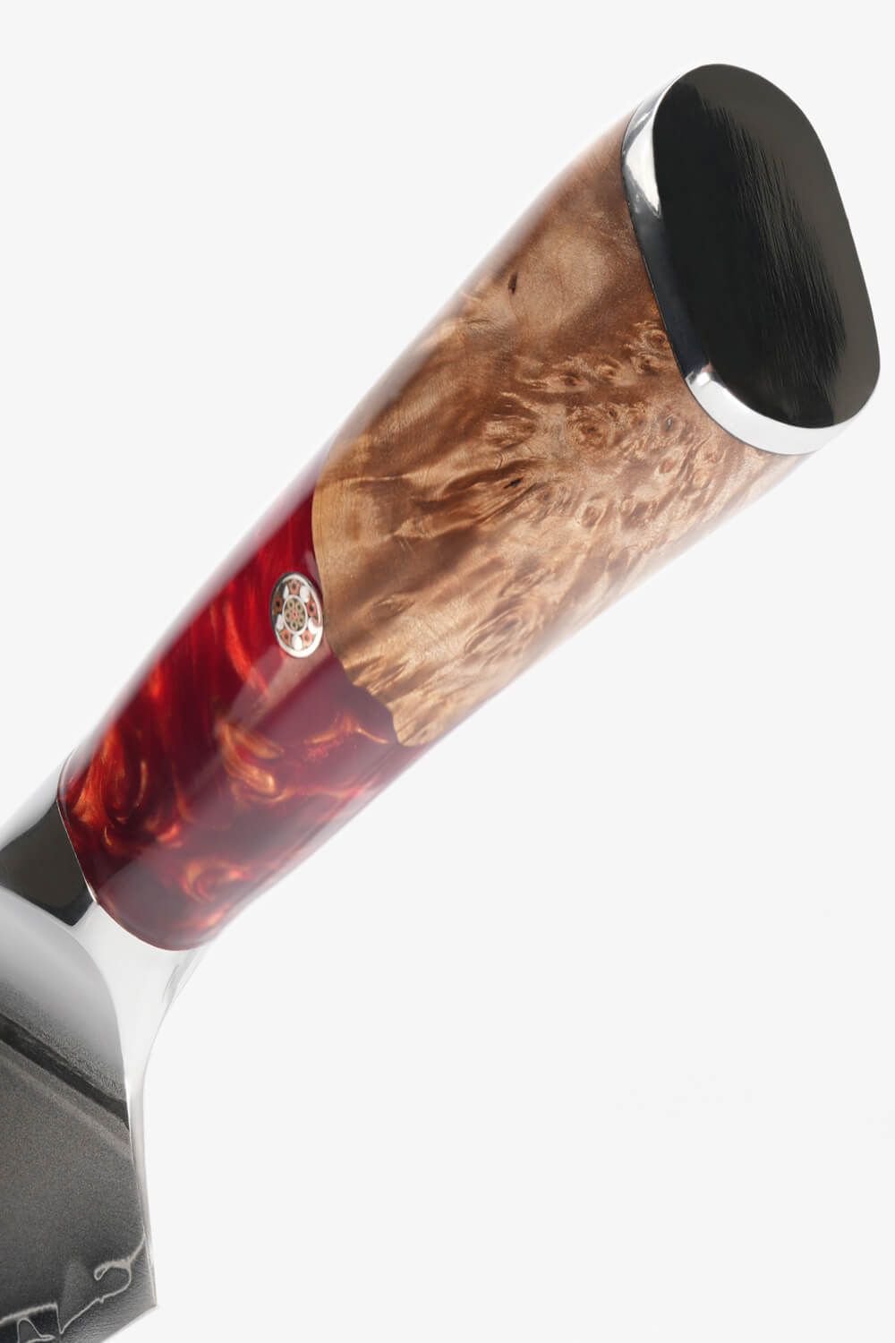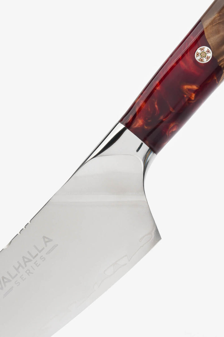 The flagship of the Valhalla series, the 8" chef knife is called to conquer meat and vegetables alike. Honor every meal with the elegant and durable “Blood Raider Red” resin handle, reinforced with stabilized wood and a stainless steel bolster for otherworldly power and grace.