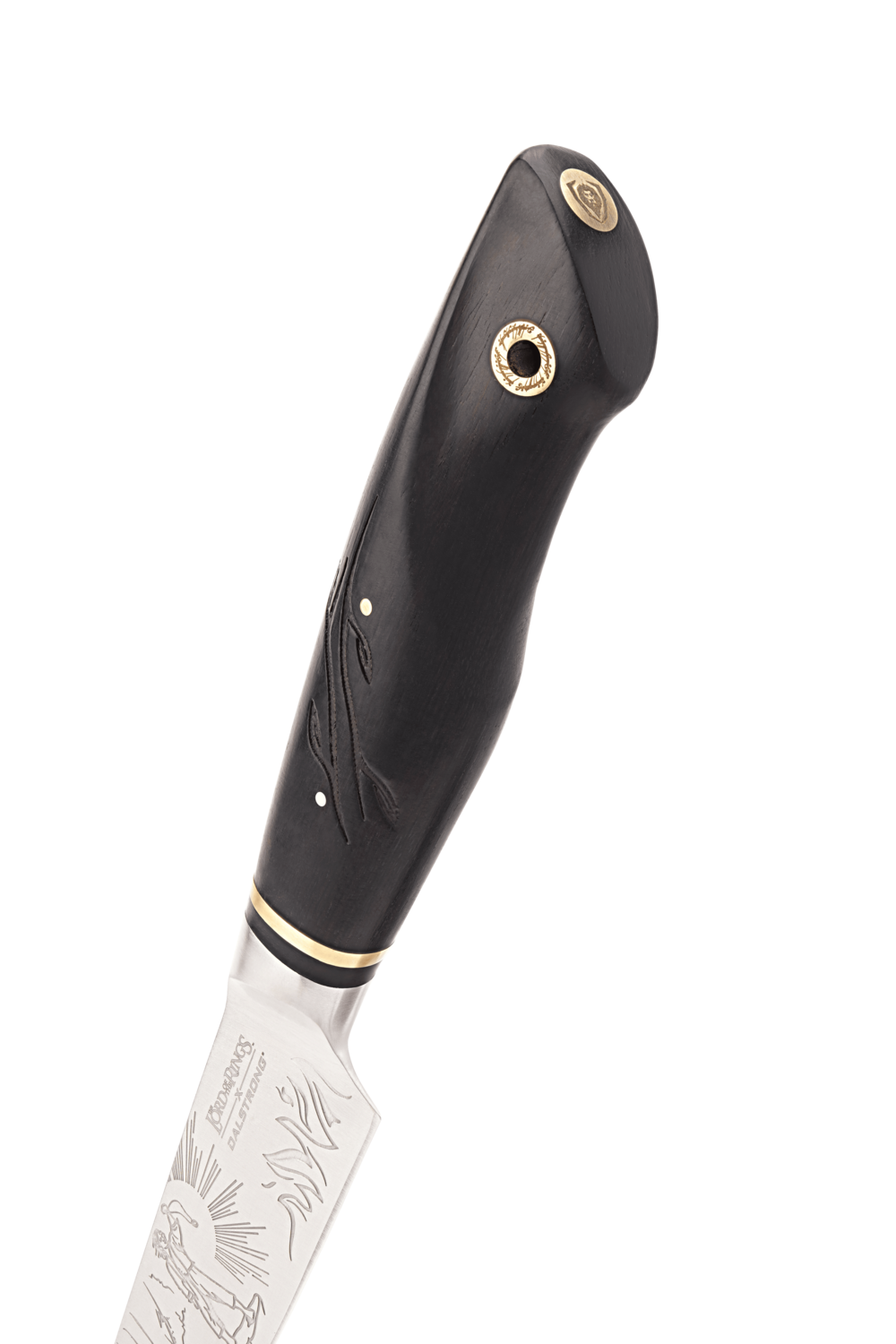 Elegant, effortless, and never missing the mark, the Lord of the Rings™ Edition 9” Carving Knife is inspired by the mastery of Legolas™ and the Elves of Middle-earth™. Crafted for clean, sweeping cuts through roasts, briskets, and holiday centerpieces, the blade depicts Legolas after taking down the mighty oliphaunt at the Battle of the Pelennor Fields. The reverse bears the Bow of the Galadhrim, and his warning: "The eye of the enemy is moving." The ebony handle, laser-etched and gracefully contoured, allows your hand to flow naturally through every motion. With a pointed tip and upward curve that echoes Elven craft, this blade cuts with the confidence of one who never wastes a shot.