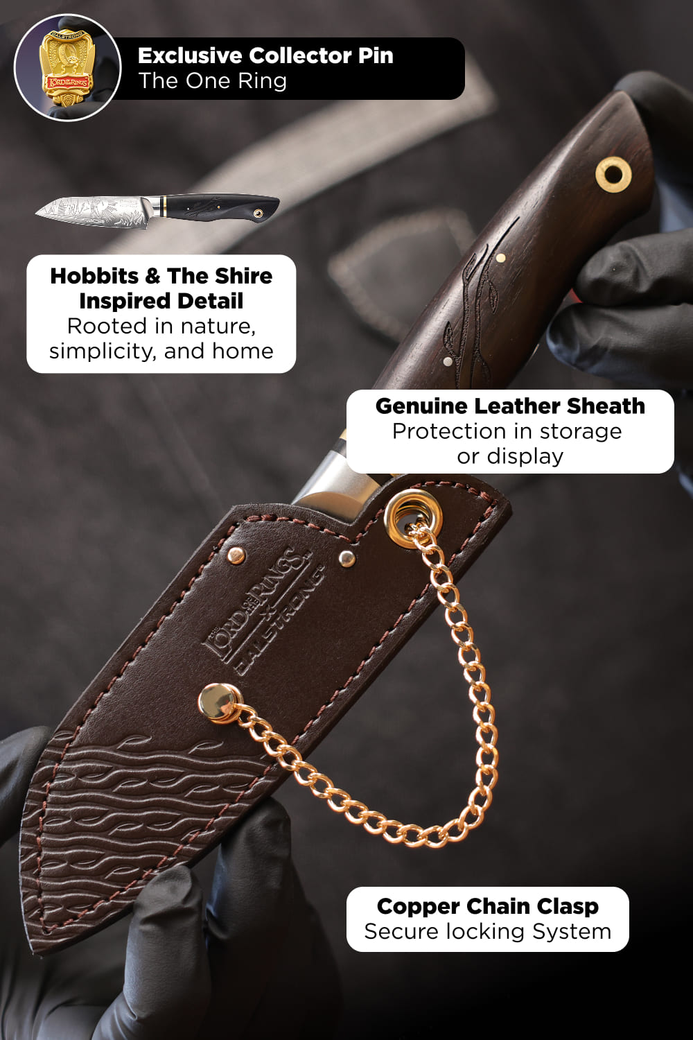 The final piece of the ultimate The Lord of the Rings™ culinary collection. While every other knife in the collection nods to individual members, the Pizza Wheel unites the Fellowship in a singular design, inspired in shape by The One Ring — the mission that bound their fate. Artwork on one side of the razor-sharp wheel depicts the fellowship, moving as one as you cut. The reverse bears the Ring inscription in Black Speech, while the central rivet features the Leaf of Lórien which marked them as allies. A premium ebony handle, laser-etched and contoured, featuring copper accents and a safety-enhancing finger-guard, guarantees control through every slice. A conversation starter, a piece to admire, and an essential kitchen tool, this piece honors the truth that even the most legendary quests end around a shared table.