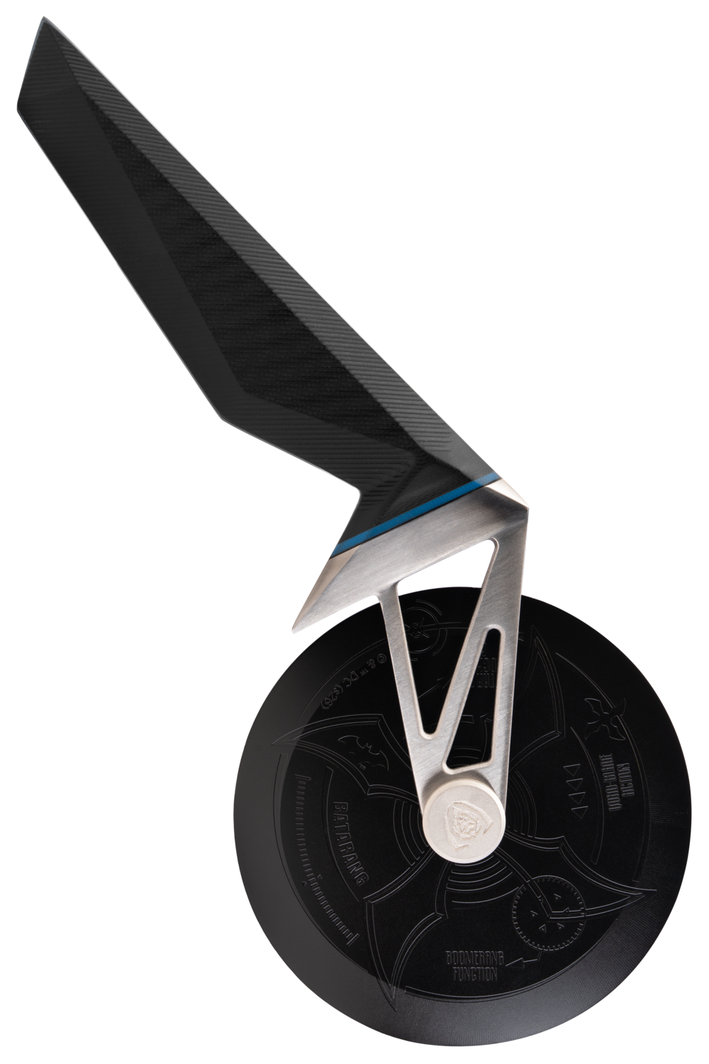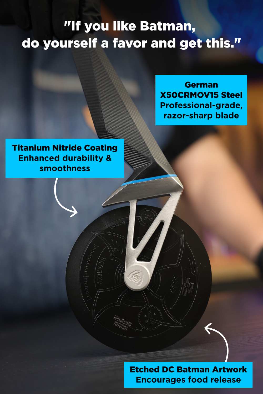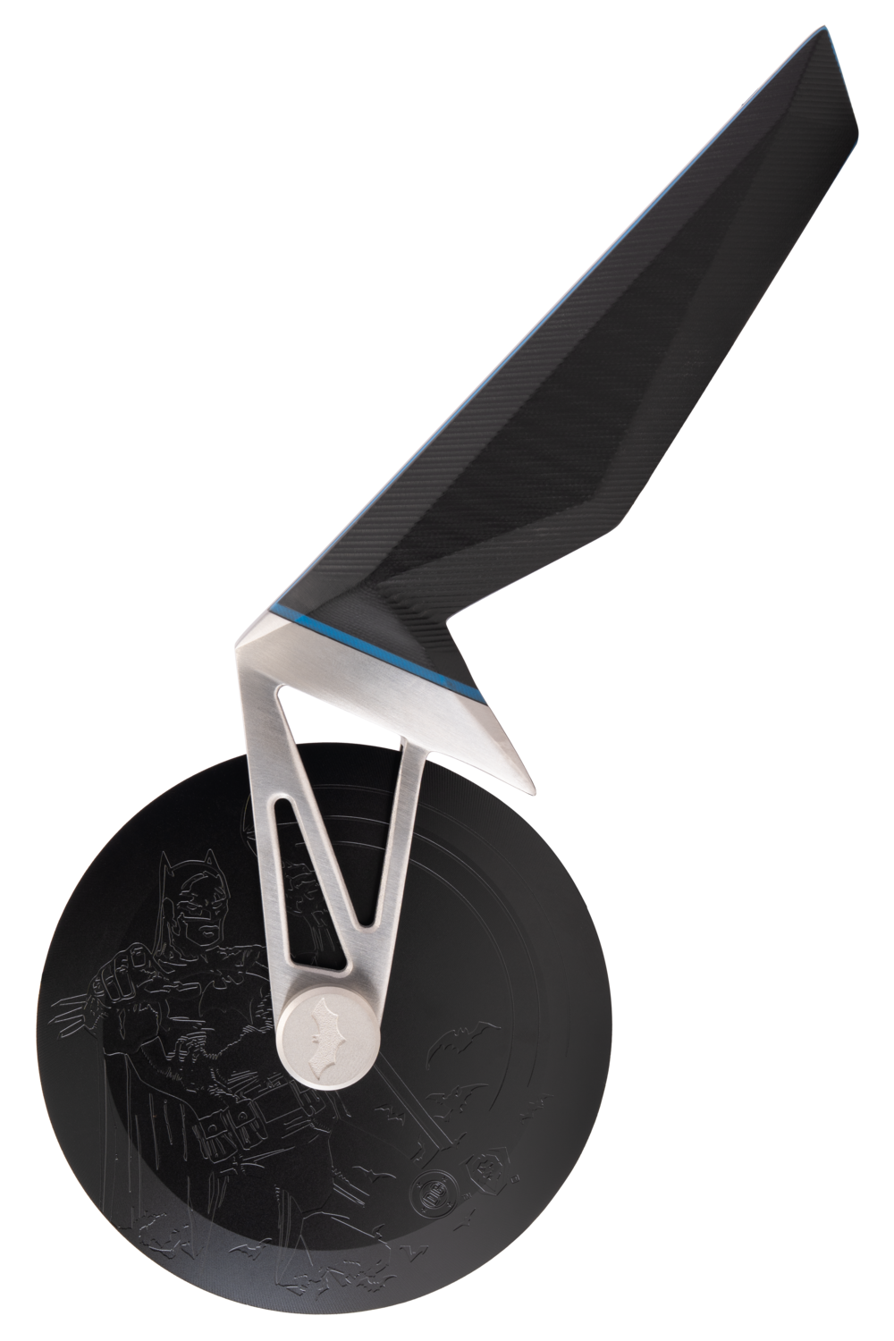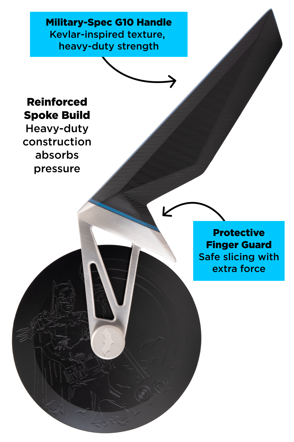 High-tech in design, heavy-duty in function. Inspired by Batman’s cutting-edge equipment, this pizza wheel glides through thick crusts and loaded toppings with laser precision. No rattling, no wobbling, no scattered crumbs, no torn edges. Engineered from professional-spec German Stainless Steel, etched with Batman artwork, and reinforced with Titanium Nitride, it brushes off impact and rust without a fuss. The overbuilt spokes and industrial G10 handle take a beating and keep performing for the long haul.