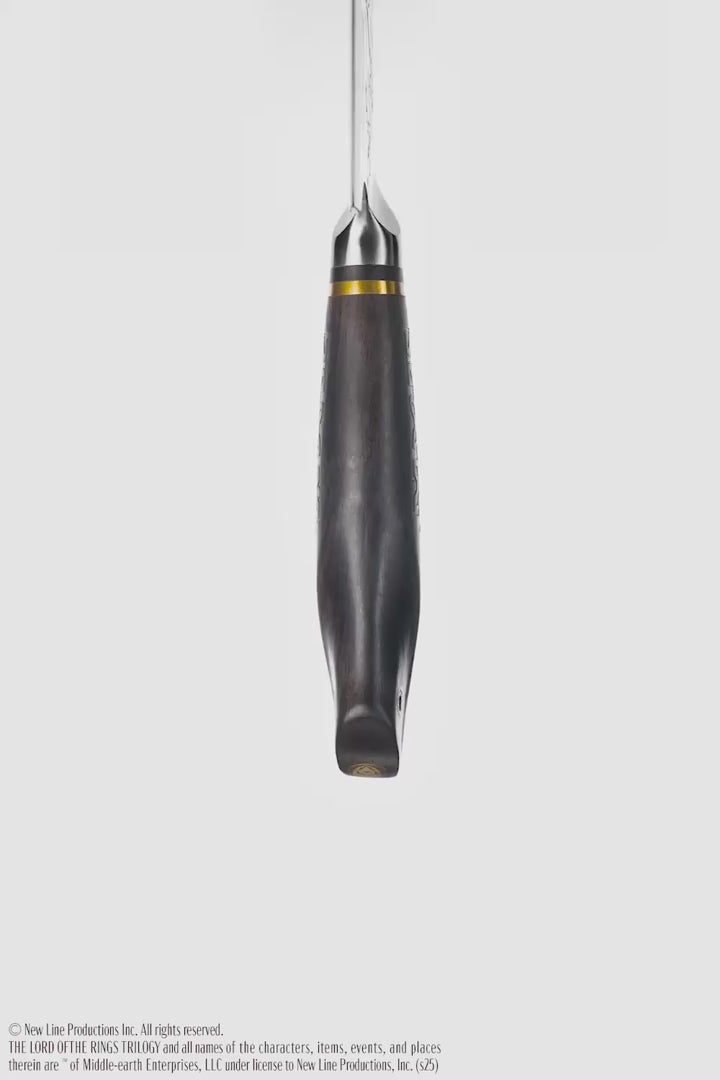 The Lord of The Rings™ Edition 9” Bread Knife pays tribute to Gandalf the White; the guide and the bringer of hope, the one who rallies people together for the greatest causes. The precision etched blade depicts his stand against the Nazgûl outside Minas Tirith; the reverse bears his staff and the words that mark the turning of the tide in the War of The Ring. Serrated and sharpened to a fine edge, with a premium ebony handle, it glides cleanly through even the heartiest crusts with a sure grip. Whether displayed at the heart of your collection or called upon when bread needs breaking, it stands as both tool and testament: A reminder that even the simplest act, done well, can hold great power.