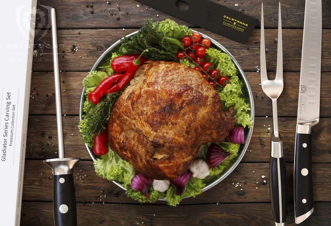 The Final Word in Carving Sets: Ensure every roast, every brisket, every turkey, and every ham is perfectly and evenly sliced, with effortless motion and seamless maneuverability. Outstanding Dalstrong craftsmanship, cutting-edge technology, stunning design elements, and premium materials. Featuring a matching full-tang and rivet engraved carving fork designed to secure meats for carving and for transferring those beautiful slices from the serving platter to the dinner plate.Popular add ons