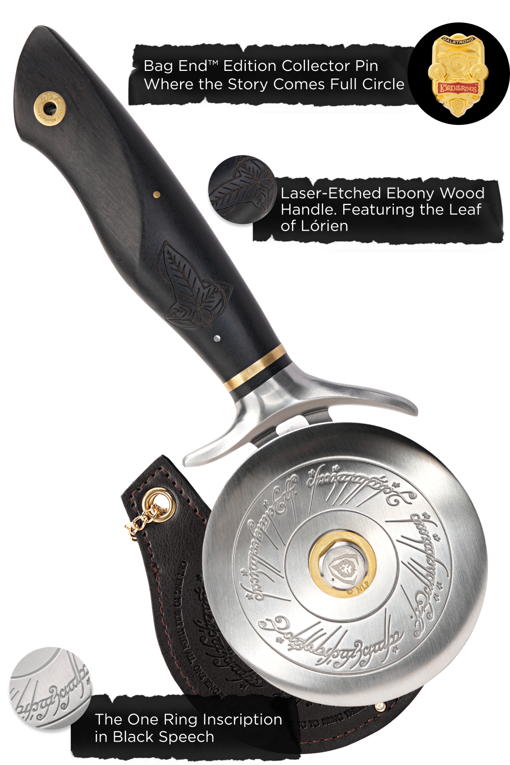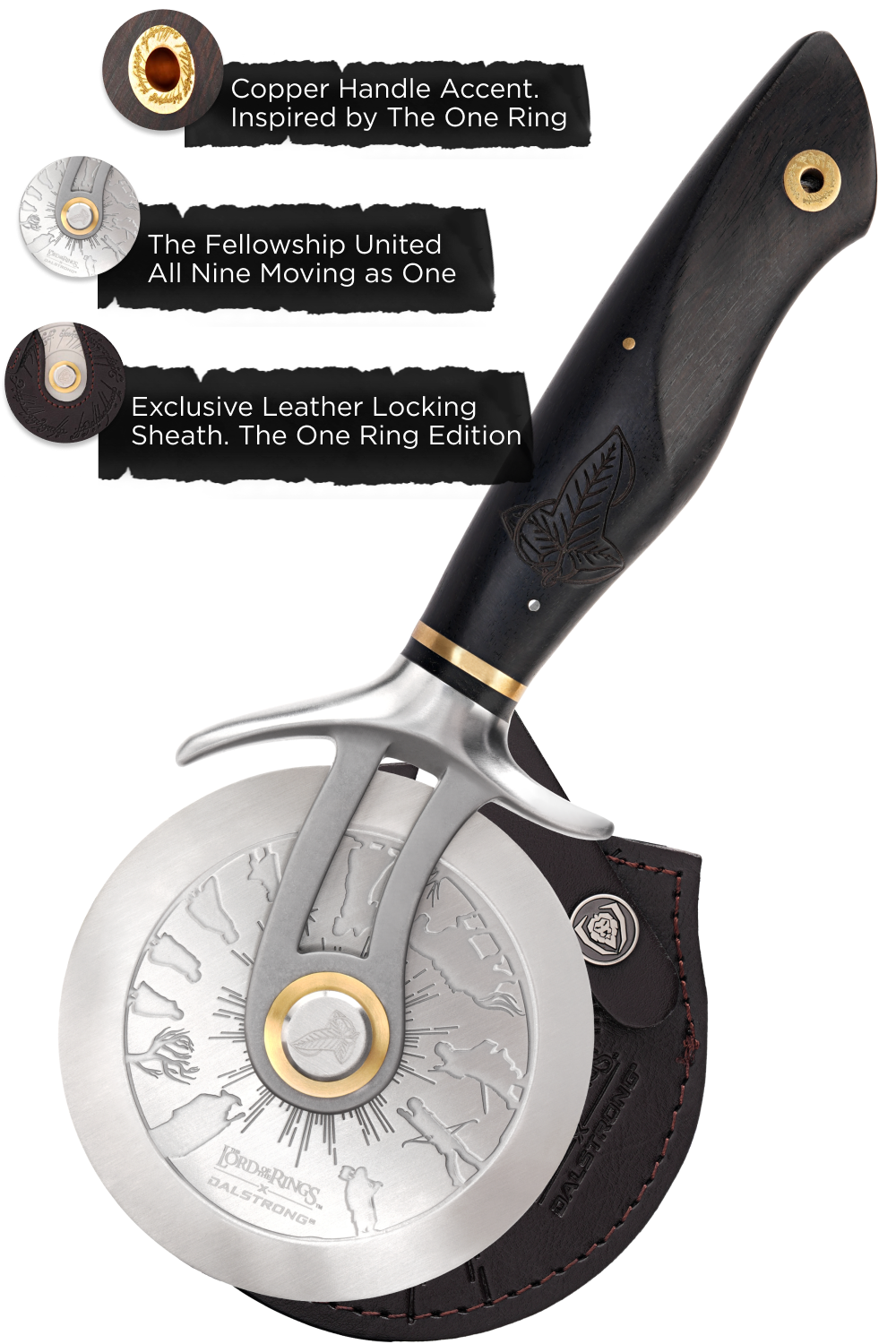The final piece of the ultimate The Lord of the Rings™ culinary collection. While every other knife in the collection nods to individual members, the Pizza Wheel unites the Fellowship in a singular design, inspired in shape by The One Ring — the mission that bound their fate. Artwork on one side of the razor-sharp wheel depicts the fellowship, moving as one as you cut. The reverse bears the Ring inscription in Black Speech, while the central rivet features the Leaf of Lórien which marked them as allies. A premium ebony handle, laser-etched and contoured, featuring copper accents and a safety-enhancing finger-guard, guarantees control through every slice. A conversation starter, a piece to admire, and an essential kitchen tool, this piece honors the truth that even the most legendary quests end around a shared table.Popular add ons